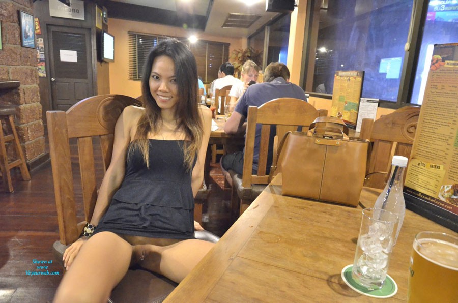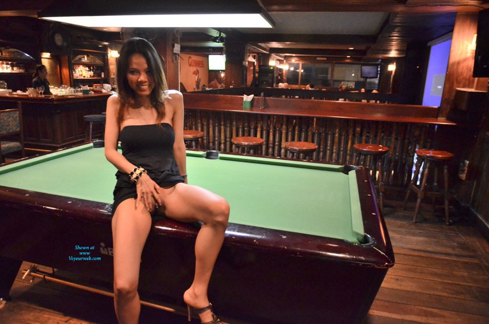 Hi Voyeurwebbers, Here are some pics of me having dinner without panties as usual. ;-) It was a staff party night at the restaurant and there were many of the employees checking me out. One of the waitresses kept trying to sneak a peak, which made me very wet, as I love girls, too. Couldn't get her to come back with us, but will keep trying! ;-p When we left dinner, we headed to play some pool and do a little show on the pool table. One of these days, I want to get fucked on a pool table in the bar. That will be one for RC! Hope you enjoy! Julie P. XOXOXOXOXOXO