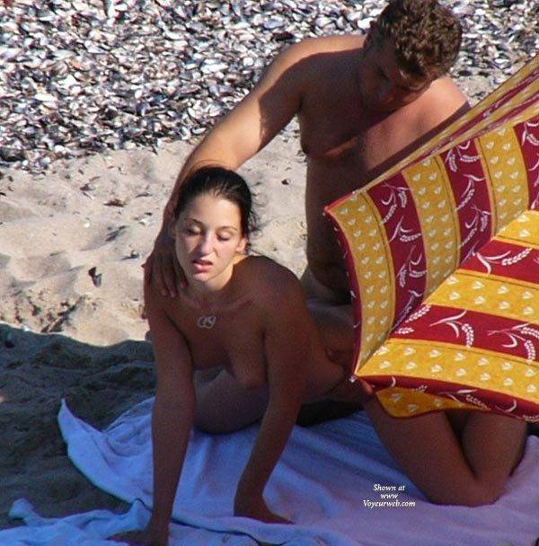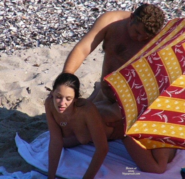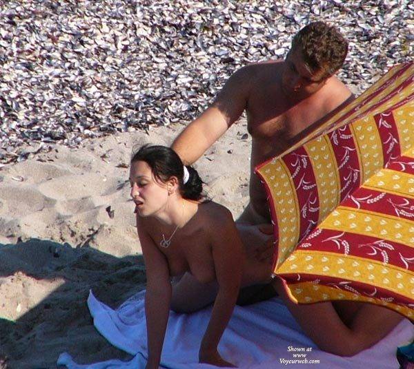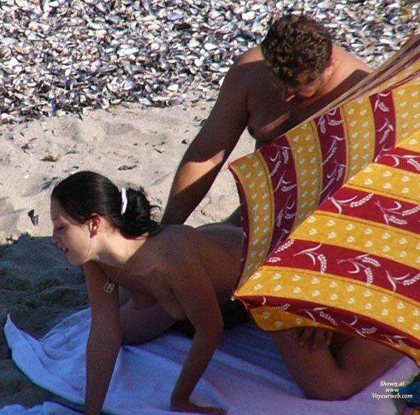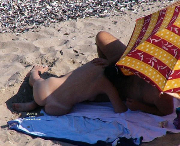 A horny couple on a empty beach. I think he finished in her mouth. Damn umbrella!!!