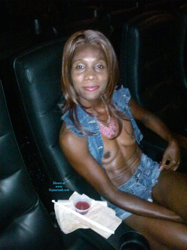 Sexy Black Fit went to the movies wearing this. No panties, vest too small to even close if she wanted to. Some people walked into the theater and she didn't even try to cover up. She sucked my dick in the theater before the movie when the lights were bright.