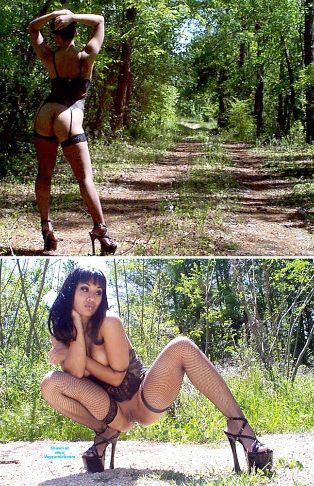 She was hiking around the backwoods in just a piece of lingerie and stockings on a dare.